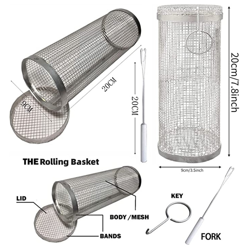 This is a stainless steel wire mesh cylinder that is designed to BBQ all the food that you normally could not grill easily. Just put the food in the basket, close the lid and throw it on the grill. Perfect for Gas, Electric and Charcoal grills.